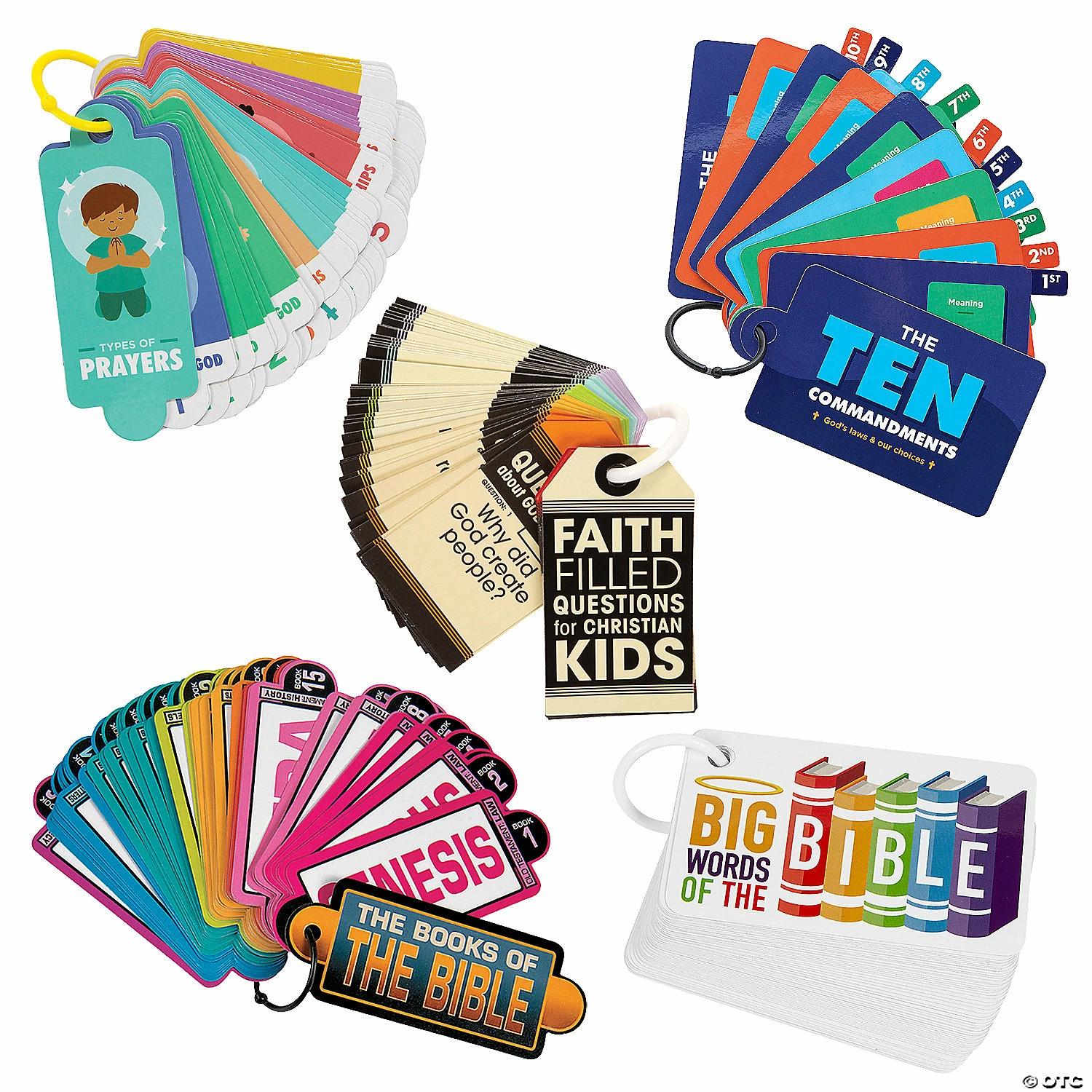Encourage little ones to grow in their faith with this collection of fun activity rings. Featuring a variety of Bible trivia and Christian values, these sets make for excellent Sunday School or VBS activities and can be sent home with children so they can continue to learn and grow at home. Find more faith favorites on this website. (60 pcs. per unit)Includes:โข 12 Cardstock Big Questions Big Answers Activity Ring Sets (Each set includes a plastic ring and 60 double-sided cards. 6 1/2″ x 2 1/2″)โข 12 Cardstock Big Words of the Bible Activity Ring Sets (Each set includes a plastic ring and 61 double-sided cards. 4 1/2″ x 2 3/4″)โข 12 Cardstock Books of the Bible Activity Ring Sets (Each set includes a plastic ring and 66 double-sided cards. 6 1/2″ x 2 1/2″)โข 12 Cardstock Prayer Starters Activity Ring Sets (Each set includes a plastic ring and 42 cards. 1 3/4″ x 6 3/4″)โข 12 Ten Commandments Activity Ring Sets (Each set includes a plastic ring and 12 double-sided cards. 4 3/4″ x 2 3/4″)โข Assortments are subject to change at any time and may vary from picture shown. Substituted items will be similar in nature.