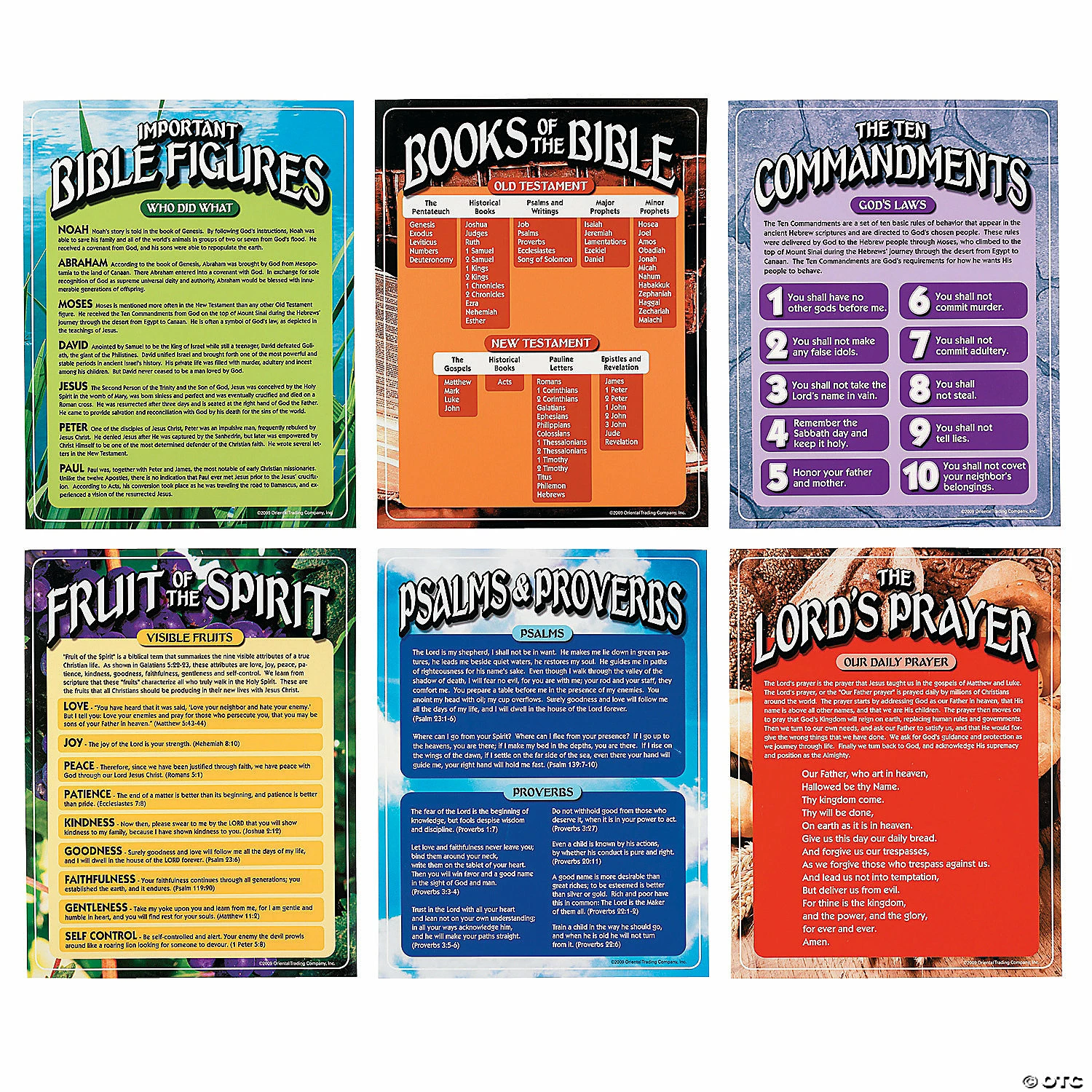 Perfect for Sunday School and VBS, these Bible Learning Posters are wonderful tools for teaching many different aspects about the NIV Bible. This colorful set of six charts make learning easy and fun and include many NIV Bible topics: Psalms & Proverbs, Fruit of the Spirit, The Lord’s Prayer, Important Bible Figures, The Ten Commandments and Books of the Bible. Cardstock. (6 pcs. per set) 17″ x 22″ © OTC