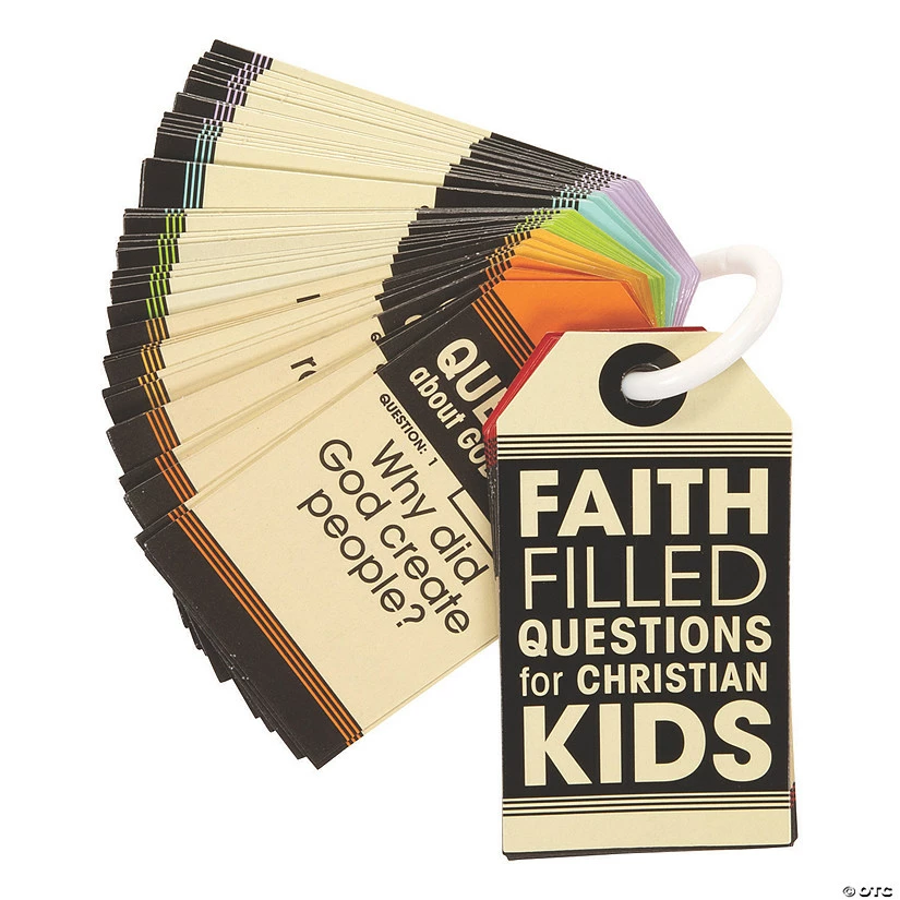 Ask faith-filled questions of all kinds to little ones, challenging and growing their spirituality. A great addition to Sunday School religious curriculum, these activity rings feature cards with a question on the front and two sets of answers on the back. “A” answers are more simplistic for primary grades while “B” are better suited for intermediate grades. These may be used to add value to a variety of faith-based lessons, from small group discussions to writing prompts to prayers! Includes a plastic ring and 60 double-sided cards. Cardstock. (6 pcs. per unit) 6 1/2″ x 2 1/2″ © OTC