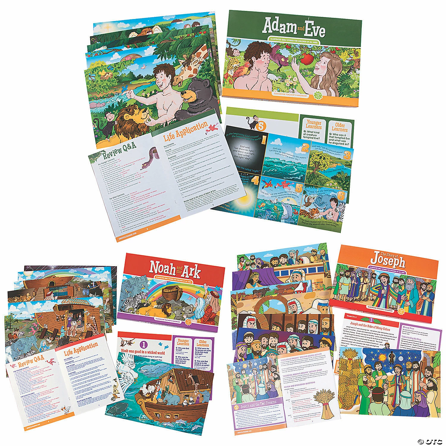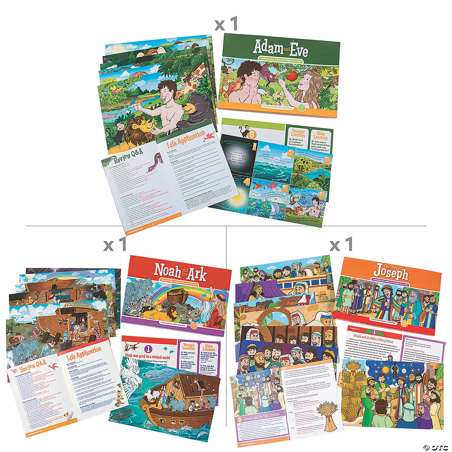 Teach your little ones about Christianity from the beginning with this Book of Genesis curriculum bundle. Perfect for homeschooling or as a Sunday School substitute, this religious education pack focuses on the Creation story, Noah & the Ark and Joseph & his robe of many colors. Each teacher companion set includes a classroom teacher’s handbook filled with scripture stories, Q&A, songs, reproducible activities & coloring sheet and game ideas; eight visual aid cards with a poster-sized image on the front and discussion prompts for various age levels on the back; and a sturdy storage box. Paper. (10 pcs. per set, 3 sets per unit) Cardboard boxes, 17″ x 11″ x 1″. © OTCIncludes:• Creation Teacher Companion• Noah & the Ark Teacher Companion• Story of Joseph Teacher Companion