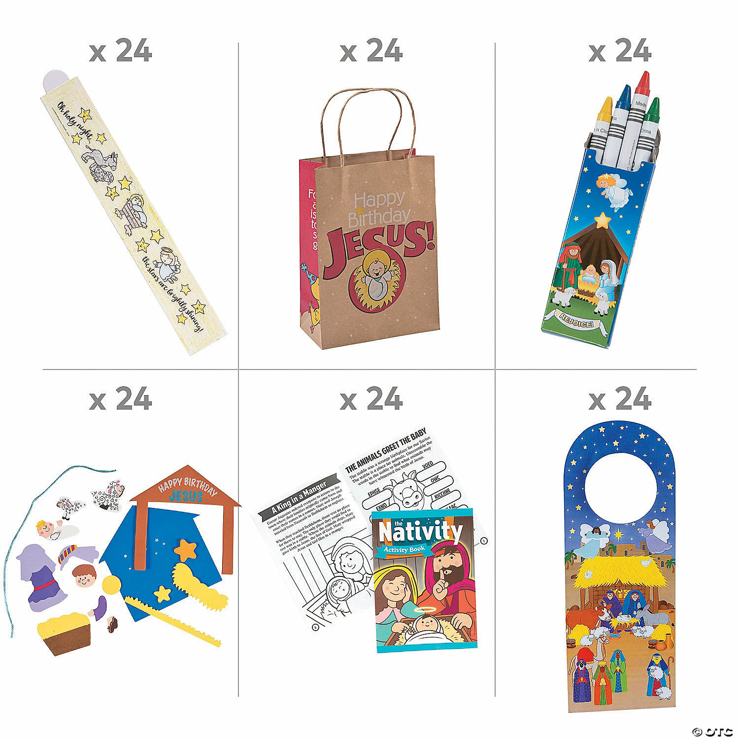 Help teach kids the real meaning of Christmas with these fun crafts! Featuring a wide variety of activities to engage their creativity, this kit has everything you need to keep young believers entertained during church services or events. (144 pcs. per unit) Includes: โข 24 Paper Color Your Own Nativity Bracelets (Includes adhesive closure. 9″)โข 24 Paper Happy Birthday Jesus Kraft Gift Bags (6 1/2″ x 3 1/4″ x 9″ with 4″ jute handles.)โข 24 Foam Happy Birthday Jesus Ornament Craft Kits (Includes self-adhesive foam pieces. 5 1/2″ All craft kit pieces are pre-packaged for individual use. Kits include instructions.)โข 24 Nativity Crayon Boxes (Four assorted crayons per Nativity scene box. Safe and non-toxic. 3 1/2″ Conforms to ASTM D-4236.)โข 24 Nativity Doorknob Hanger Sticker Scenes (Includes 12 4″ x 10 1/2″ backgrounds and 12 sticker sheets. Stickers are repositionable and acid free. Each sheet contains 72 assorted stickers.)โข 24 Paper Nativity Learning Activity Books (5″ x 7″ 12 pgs.)โข Assortments are subject to change at any time and may vary from picture shown. Substituted items will be similar in nature.