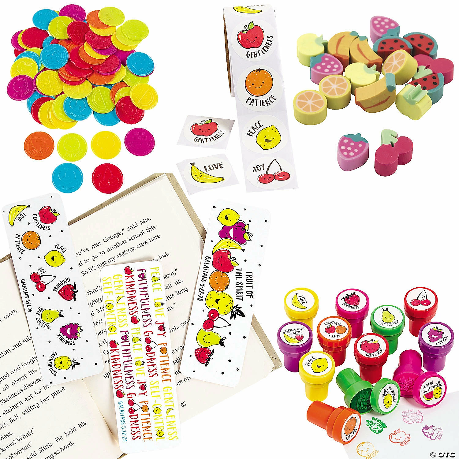 Teach kids what it means to live in accord with the Holy Spirit! The colorful goods in this kit show smiling pieces of fruit alongside Bible verses and upstanding characteristics of โGentlenessโ, โJoyโ, โSelf-Controlโ and more. Great for class stations during VBS, as handouts during church meetings or birthday party favors! (640 pcs. per unit)Includes:โข 48 Cardstock Fruit of the Spirit Bookmarks (2″ x 6″)โข 300 Rubber Bulk Mini Fruit Erasers (3/4″)โข 144 Plastic Fruit of the Spirit Coins (1 1/2″)โข 100 Paper Fruit of the Spirit Scented Stickers (1 1/2″)โข 48 Plastic Fruit of the Spirit Stampers (1 1/2″ Safe and non-toxic. Conforms to ASTM D-4236.)โข Assortments are subject to change at any time and may vary from picture shown. Substituted items will be similar in nature.