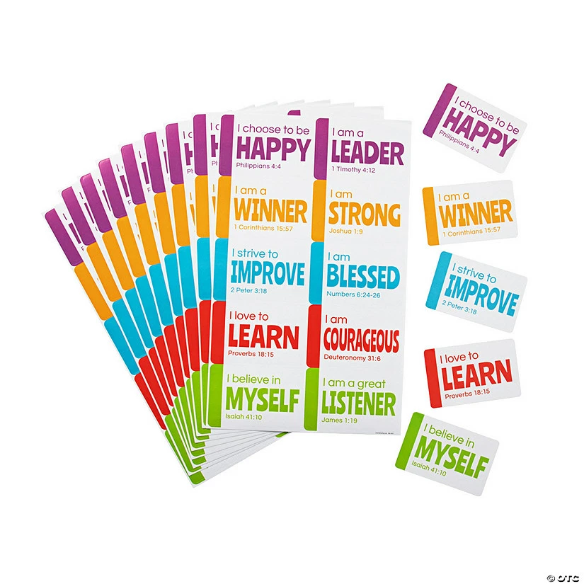 These affirming stickers are a great addition to Sunday School classroom supplies and feature positive statements based off Scripture. โI choose to be happyโ, โI am a winnerโ, โI strive to improveโ, โI love to learnโ, โI believe in myselfโ and more are featured on these colorful stickers. Hand these out to accompany Biblical lessons on life choices. Paper. (6 stickers per sheet, 10 sheets per unit) Stickers, 3 1/2″ x 2 1/4″; sheets 7 1/2″ x 12 1/2″. ยฉ OTC