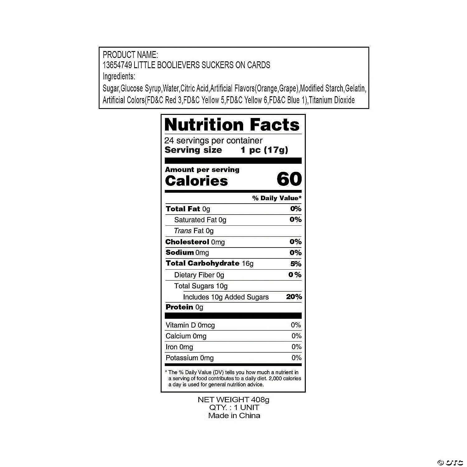 Send your little boolievers home with a tasty reminder of Jesus with these Little Boolievers Pops. Each sucker includes a fun card with a joyful statement about Jesus. These pumpkin-shaped lollipops are a unique giveaway during Trunk or Treat events or during Sunday School. Includes 2″ pumpkin-shaped pops on 4″ plastic sticks. Grape and orange flavors. Each comes with a 3″ x 3″ paper card. Individually wrapped. (24 pcs. per unit) Total wt., 14 oz. Fat-free. Simple assembly required. © OTC• Candy is non-returnable. For more information, visit our “Return Policy” page located on our website. • Ingredient, nutrition, allergen and other product information are provided on our Web and Mobile sites for reference purpose only, without warranty or representation as to accuracy. Manufacturers adjust their labeling regularly and are solely responsible for the accuracy of the information. For general questions concerning these items, please contact our customer service at 800-228-0475.