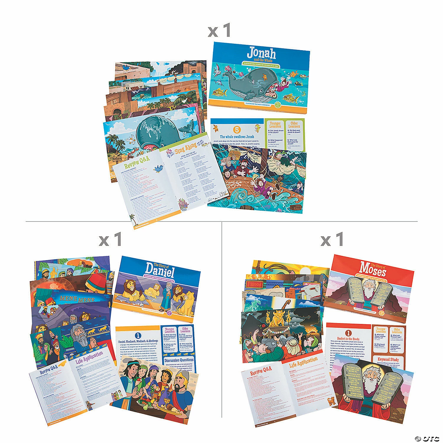 Tell three major stories from the Old Testament in fun ways for little believers with this bundle of teacher companion packs. Perfect for Sunday School, VBS and homeschooling, these comprehensive religious curriculum packets focus on Moses & the Hebrews’ exodus from Egypt, Jonah & the Whale and Daniel & the Lions Den. Each companion set includes a classroom teacher’s handbook filled with scripture stories, Q&A, songs, reproducible activities & coloring sheet and game ideas; eight visual aid cards with a poster-sized image on the front and discussion prompts for various age levels on the back; and a sturdy storage box. Paper. (10 pcs. per set, 3 sets per unit) Cardboard boxes, 17″ x 11″ x 1″. © OTCIncludes:• The Story & Life of Moses Teacher Companion• Jonah & the Whale Teacher Companion• The Story of Daniel Teacher Companion