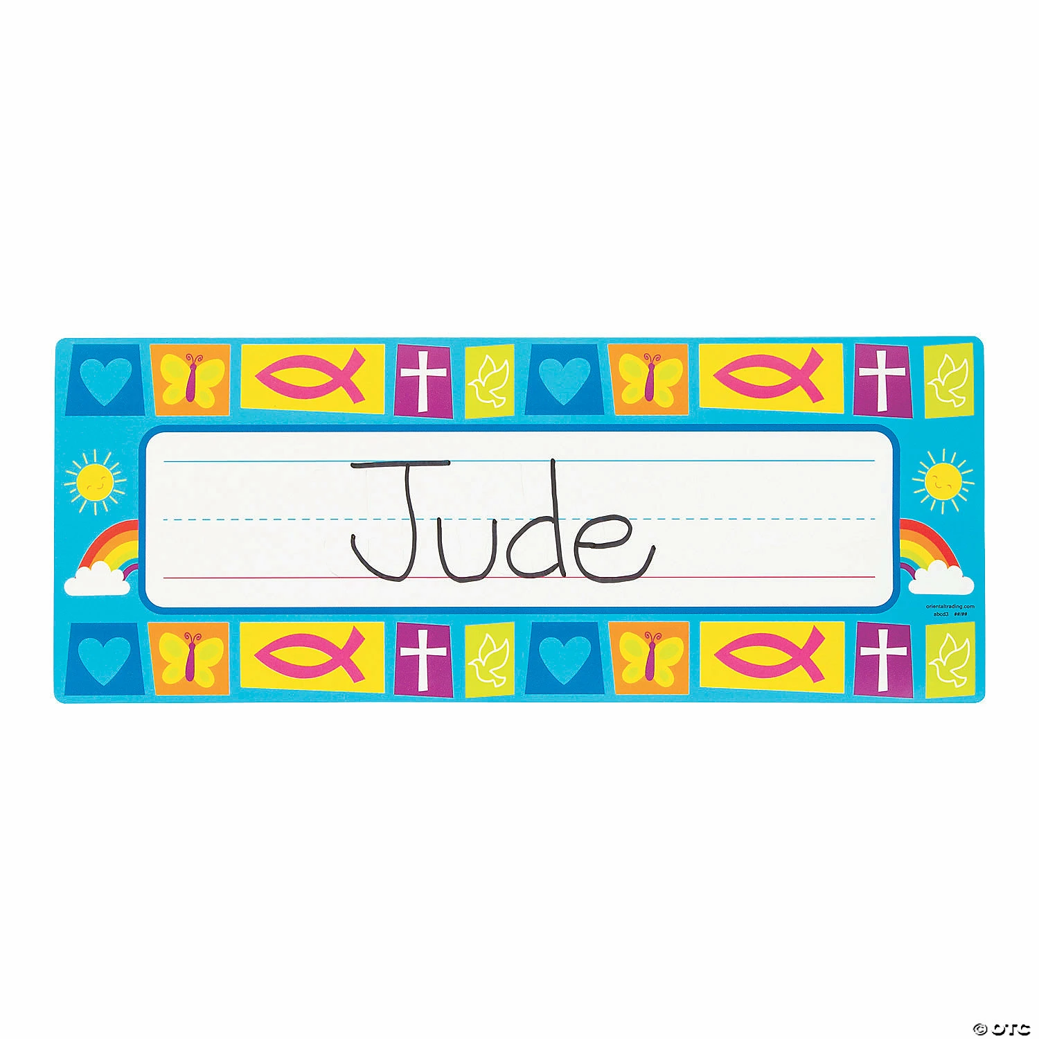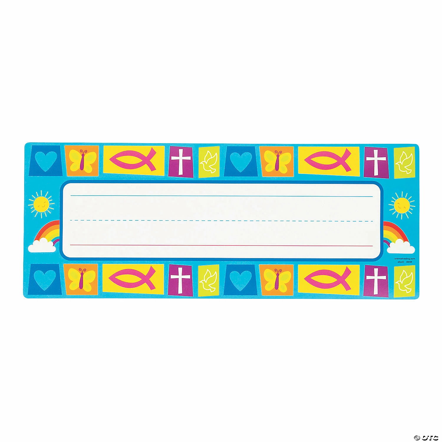 Welcome your Sunday School or religious education students in style with these Religious Symbol Name Plates! Write in your young students’ names and attach them to their desks so they’ll all know where to go with little fuss before you start your lessons. Add these desk plates to Sunday School supplies and classroom organization essentials! Cardstock. (2 dozen per unit) 10″ x 4″ © OTC