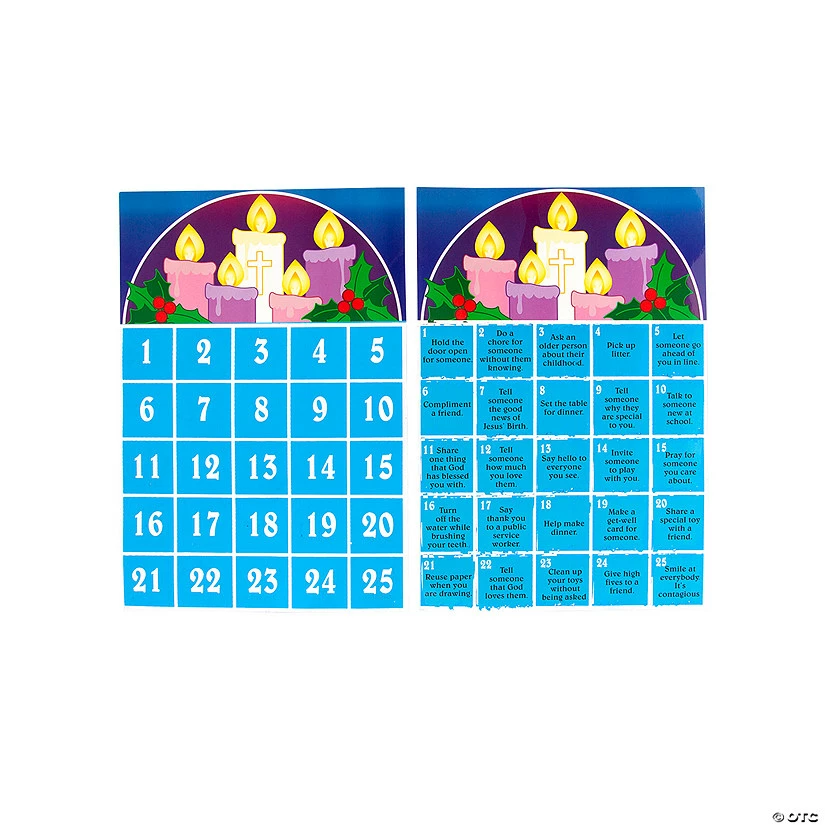 These scratch calendars are a great activity for kids in Sunday School or at home to celebrate the season of Advent as they countdown to Christmas. Each day in December, little ones can scratch off the corresponding day to reveal a thoughtful act of kindness for them to complete. Find more great Advent supplies and prizes on our website. Includes scratching tools. Cardstock. (1 dozen per unit) 8 1/2″ x 12 1/2″ © OTC