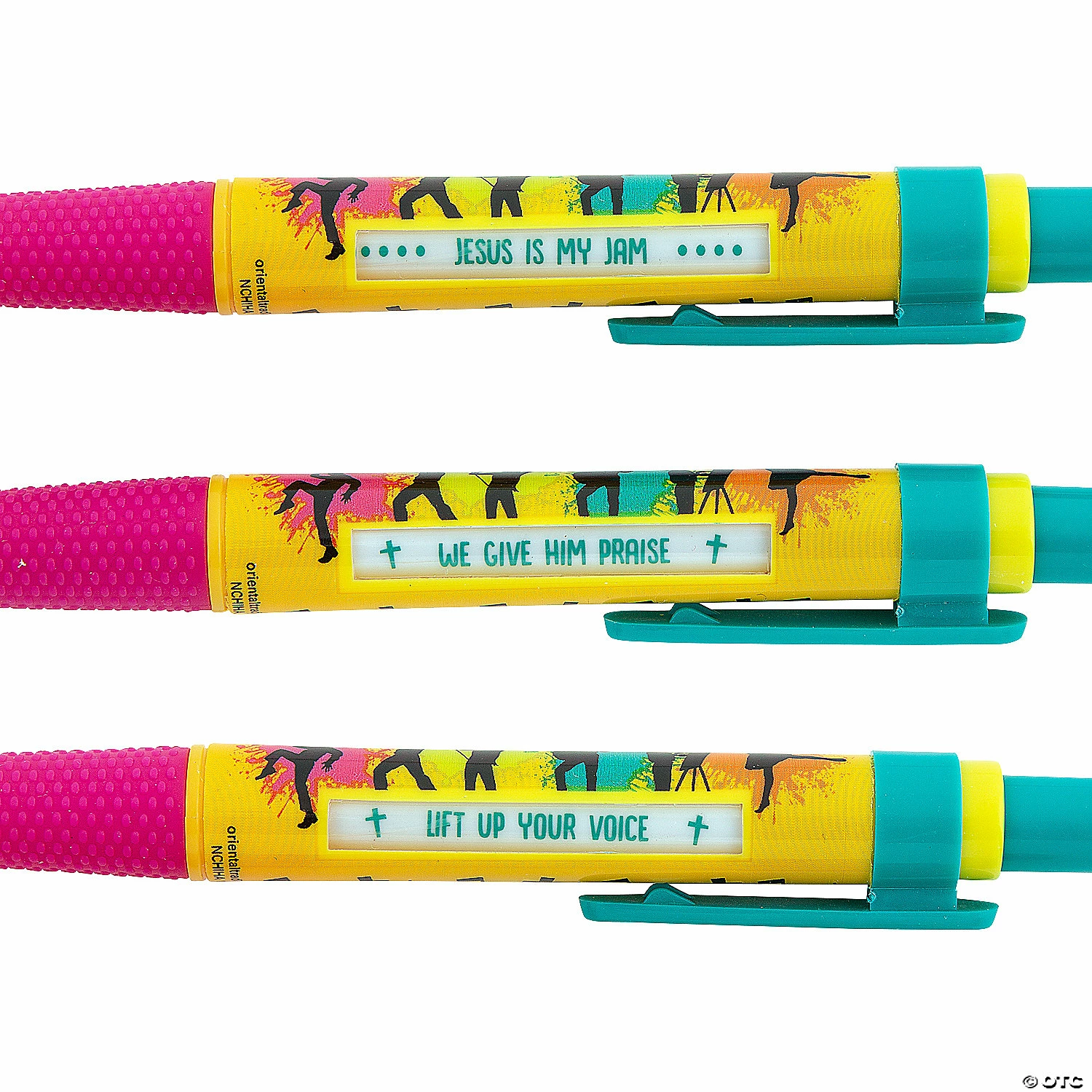 Have these message pens on hand at Studio VBS to use as general supplies or to hand out as VBS prizes and giveaways. Each colorful pen features black ink and revolving messages that appear with a click of the pen. These Studio VBS themed pens are a VBS supply must-have that can be handed out at registration or during the session. Each pen includes 6 messages. Black ink. Plastic. 5 1/2″ ยฉ OTC