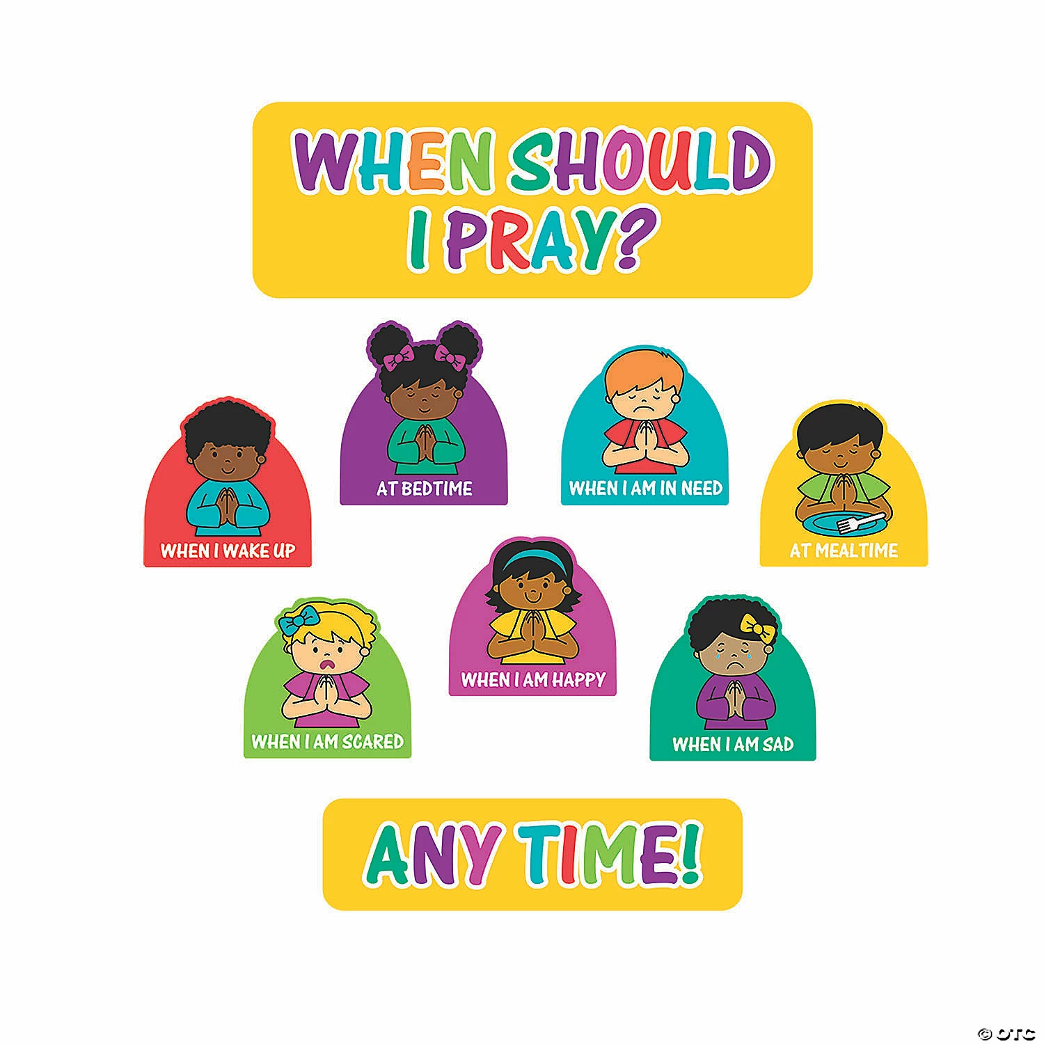 Teach kids that anytime is a good time to pray! Perfect for Sunday School classroom décor, these wall cutouts illustrate different occasions to pray during, from when you’re happy or in need to at mealtime or right when you wake up. By following these bulletin board accents, little believers will build a better relationship to their faith and God! Paper. (9 pcs. per unit) 5 3/4″ – 6″ x 7″ – 20″ © OTC
